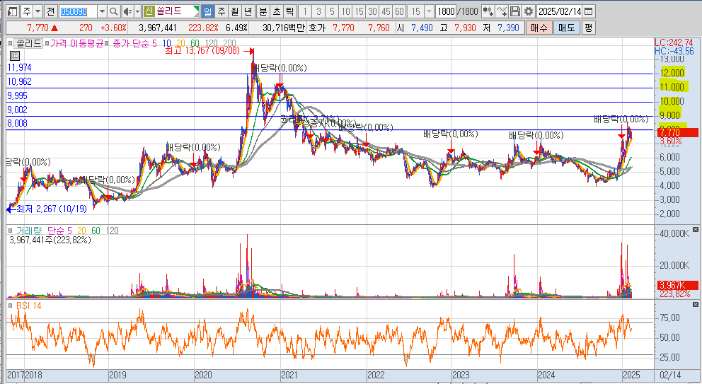 최근 양자컴퓨터 이슈로 대세상승흐름을 보여주고 있는데 특이한 점은 양자컴퓨터 섹터의 흐름과 꼭 비슷한 흐름을 보여주지는 않는다는 것입니다. 이번 상승이 2020년 고점에 도전할지는 흐름을 관찰해 봐야 할 것이지만 차트상 저항점으로 보이는 부분에서 어떤 흐름을 보이는지를 관찰하면서 매도 매수 시점을 잡아야 할 것입니다. 기본적으로 저항으로 보이는 지점을 8000원 9000원 10000원 각각 떨어지는 가격에서 저항 지점으로 잡히고 있습니다.
